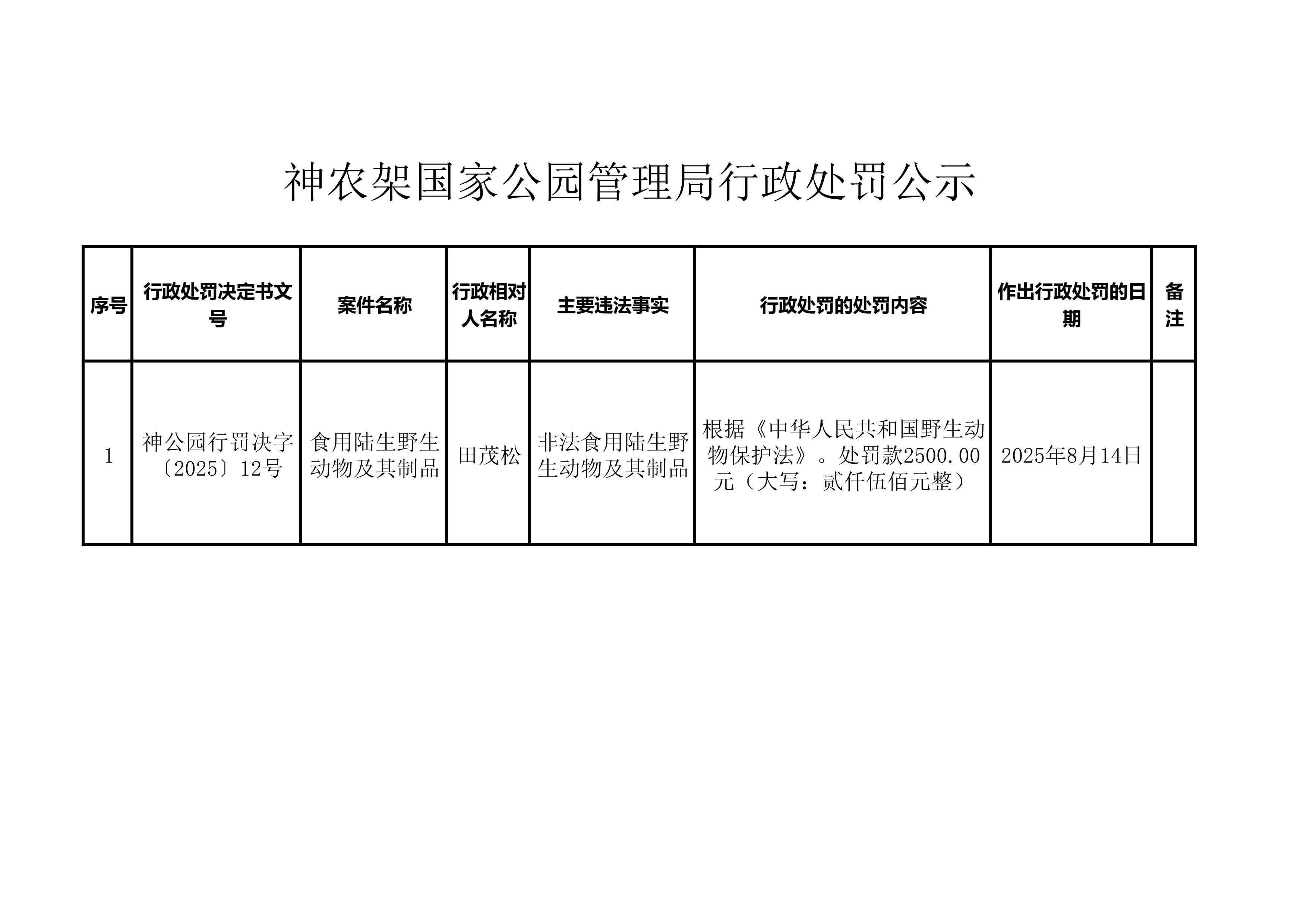神农架国家公园管理局行政处罚公示