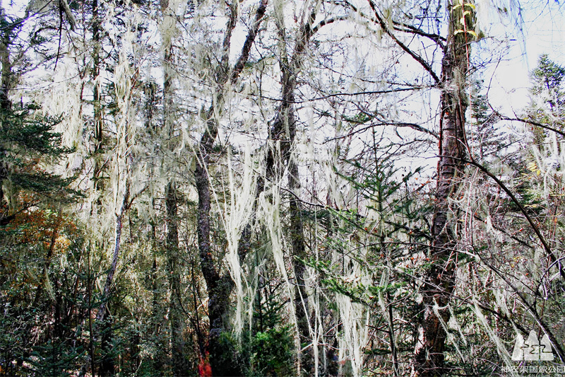 走近神农架的原始森林,迎接你的除了遮天蔽日的莽莽林海,还有森林中那些轻纱帘般的松萝,挂在云杉、冷杉等高大树木的枝条上,随风飘散,给森林增添了一丝神秘玄幻。