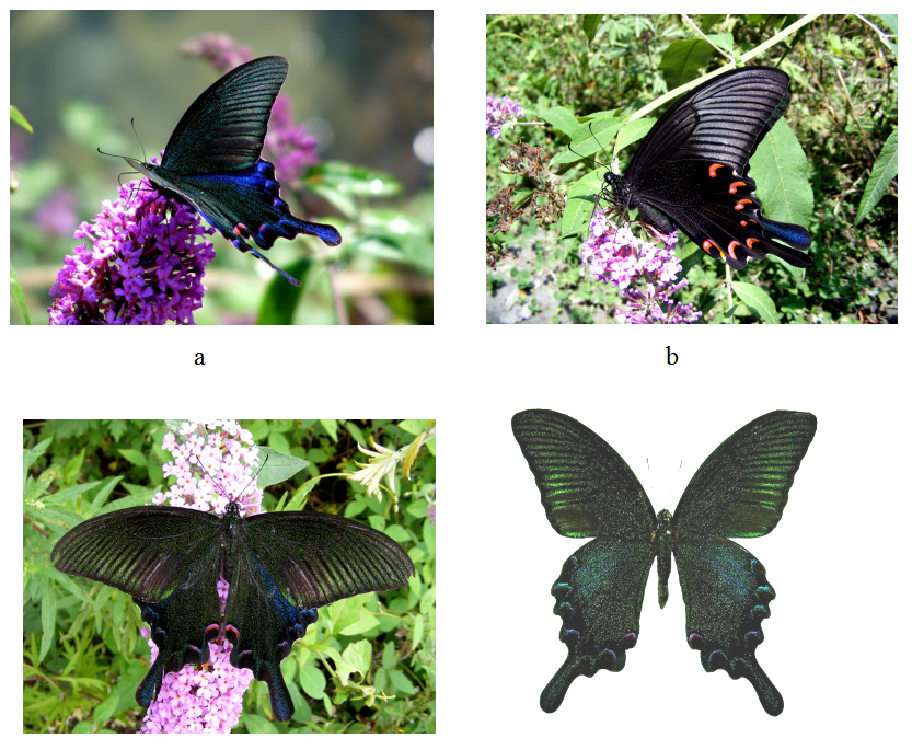 碧凤蝶Papilio bianor Cramer a.雄♂侧,b. 雄♂侧,c. 雌♀正,d. 雌♀正