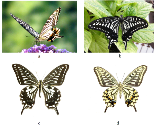 柑橘凤蝶Papilio xuthus Linnaeus a.雄♂侧, b.雌♀正, c.雄♂正, d.雄♂反