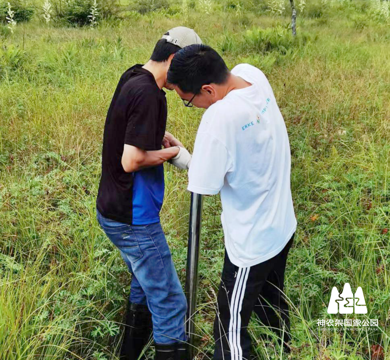神农架国家公园候选区科学研究院研究员马国飞和同事莫家勇在大九湖做泥炭藓层调查。(何塞 摄)