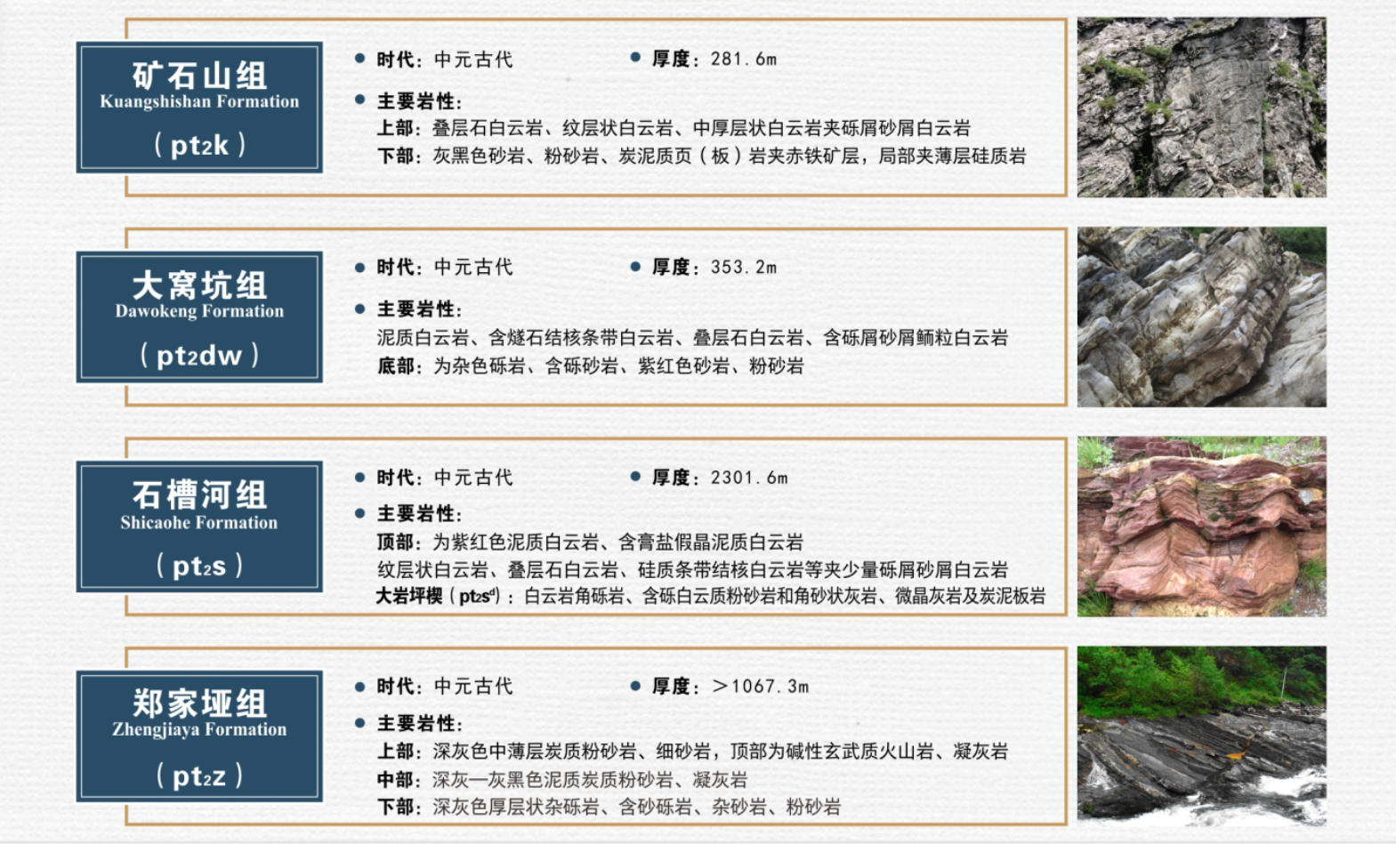 神农架群是形成于距今约16—10亿年的中元古代地层,是以碳酸盐岩为主体的沉积地层,沉积厚度达四千余米,是神农架地区最古老的地层。它自下而上划分为郑家垭组、石槽河组、大窝坑组和矿石山组,并与新元古代早期的凉风垭组(距今约10—8亿年)共同构成了神农架地区古老的褶皱基底。