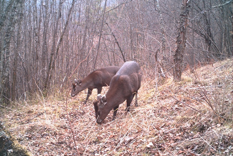 雄毛冠鹿都有一对尖利的上犬齿,如同獠牙般从嘴中伸出,但雄性上犬齿比雌性大,这是毛冠鹿和麝类动物区别于其他鹿科动物的第二体征。相信大家已经能猜出雄性犬齿的作用了。没错,犬齿即是雄性争夺配偶时的致命武器。谁的犬齿锋利,谁就占据优势,得以繁殖下一代并将自身基因传承下去。这样,在长期的自然选择过程中,尖锐而又锋利的犬齿性状将得到遗传表达。但锋利的犬齿并不能改变毛冠鹿的食草本性。它的食性与黄麂相似,喜食蔷薇科、百合科和杜鹃花科植物的枝叶,有时也会到山区村舍附近的田园中觅食。一般情况下,它们结伴而行,不会单独活动,群体活动是毛冠鹿提高警戒及时发现天敌的有利保障。