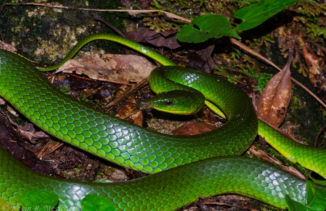 这条绿蛇和有毒的竹叶青蛇外形非常相似,都有着显眼的翠绿体色。但它只是一条翠青蛇,隶属爬行纲有鳞目蛇亚目中的游蛇科。为了在环境险恶的森林中生存,缺少毒牙的翠青蛇只能在体色上大做文章,它模拟成竹叶青蛇的模样,借助翠绿的体色来恐吓并蒙骗敌人。虽然翠青蛇模仿毒蛇的本领一流,但也常因这致命的体色而被人们误认成有毒的竹叶青蛇,进而遭遇不幸。