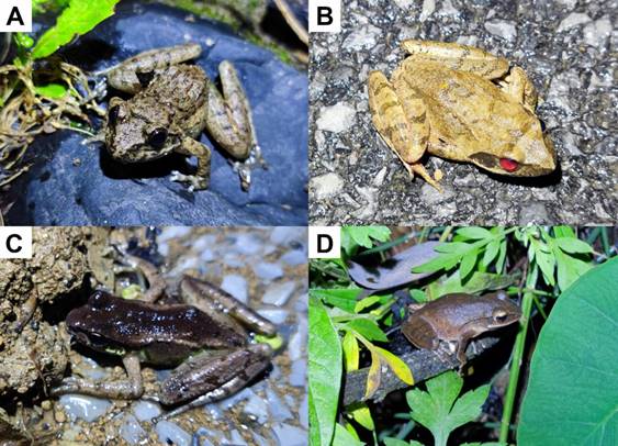 图3 无尾两栖类:A.隆肛蛙(Feirana quadranus);B.中国林蛙(Rana chensinensis);C.棘皮湍蛙(Amolops granulosus);D.布氏泛树蛙(Polypedates braueri)