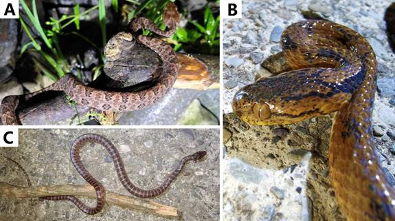 图5 蛇类:A.原矛头蝮(Protobothrops mucrosquamatus);B.平鳞钝头蛇(Pareas boulengeri);C. 赤链蛇(Lycodon rufozonatus)