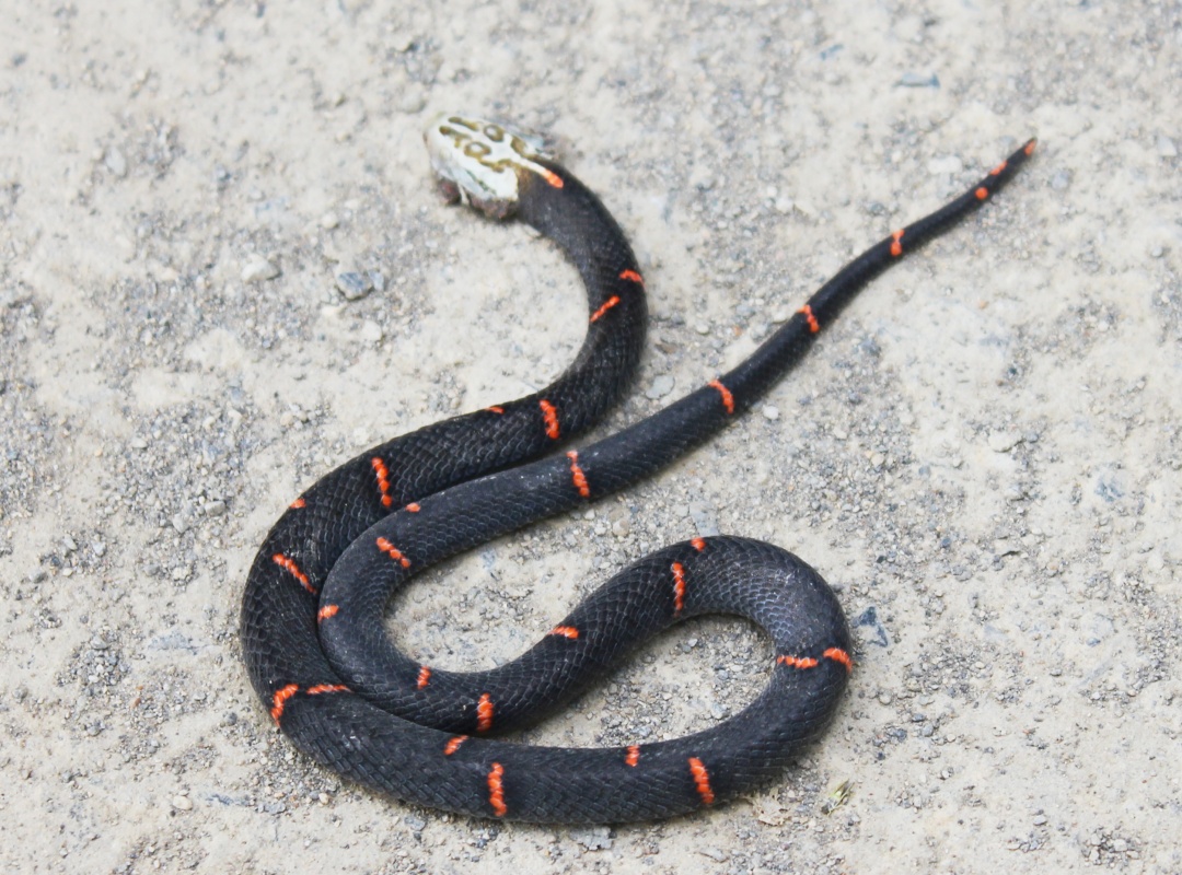 头略扁,灰白色,头背有两条浅褐色纵纹。背面黑褐色,有浅褐斑纹。躯、尾背面紫褐色,有左右镶细黑边的朱红色窄横纹。